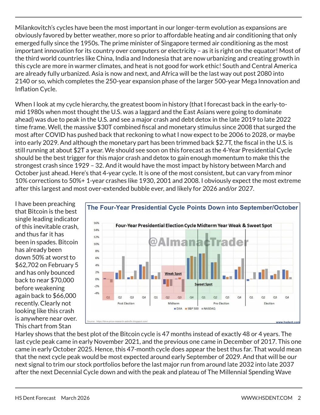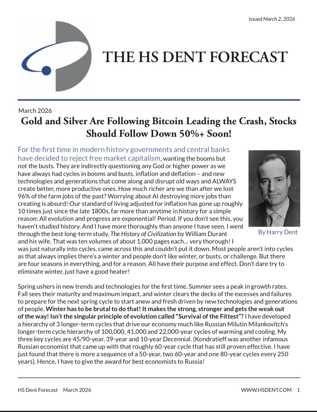 In the HS Dent Forecast, Harry covers macroeconomic changes and events both in the U.S. and around the world, encompassing everything from demographics to global debt. He also uses technical analysis and cycles, including his proprietary cycle work, to let readers know what lies ahead. Whether you run a small business, a large business, or just your personal investment portfolio, Harry’s research is a “must-have” item.